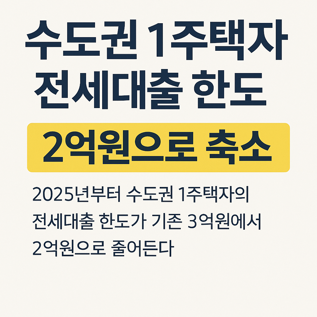 2025년부터 수도권 1주택자의 전세대출 한도가 3억원 → 2억원으로 줄어듭니다. 이는 가계부채 관리와 부동산 시장 안정화를 위한 조치로 풀이됩니다.
